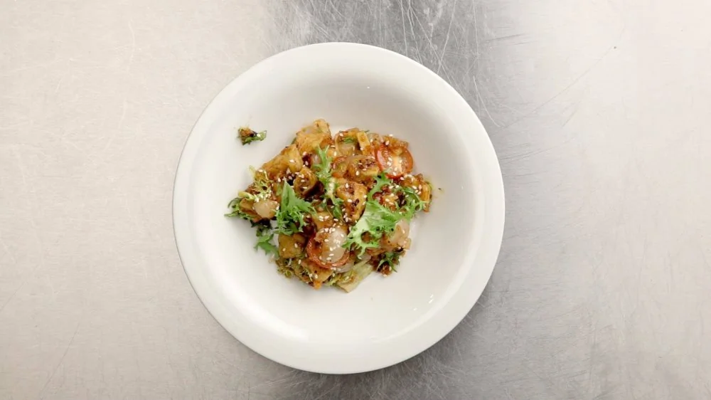 ШАГ 7 Нарезать помидоры, личи и салат. Затем приготовленные ранее баклажаны, овощи и зелень перемешать с соусом, слегка подбрасывая. Подавать на стол, украсив кунжутными семечками.