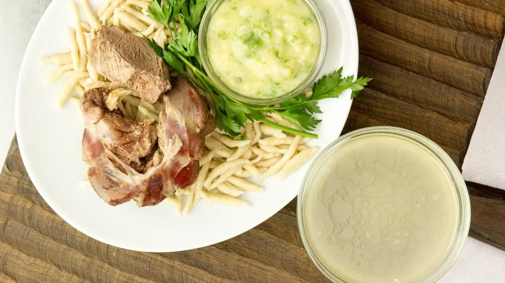 ШАГ 3 Для соуса берблан отварить картофель и сделать пюре. Затем смешать картофель со 100 мл бульона, рубленной зеленью петрушки и чесноком. Подавать все отдельно – бульон, галушки и соус.
