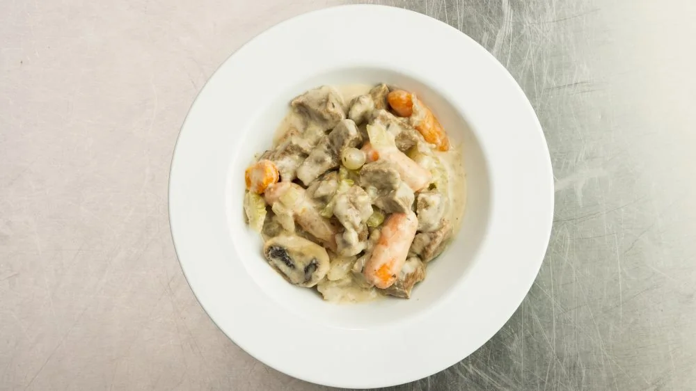 ШАГ 3 Грибы очистить и разрезать на четверти. Сельдерей очистить от волокон и разрезать на небольшие кусочки по 2-3 см. Добавить овощи к мясу. Варить до тех пор пока телятина не станет нежной, около 20 минут. Отварить рис для подачи.