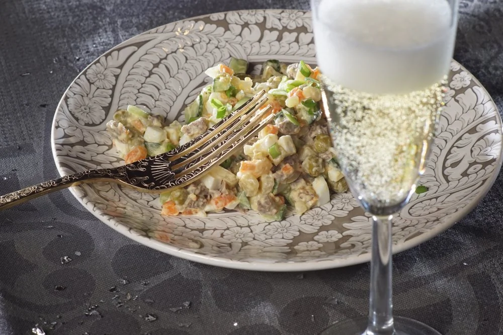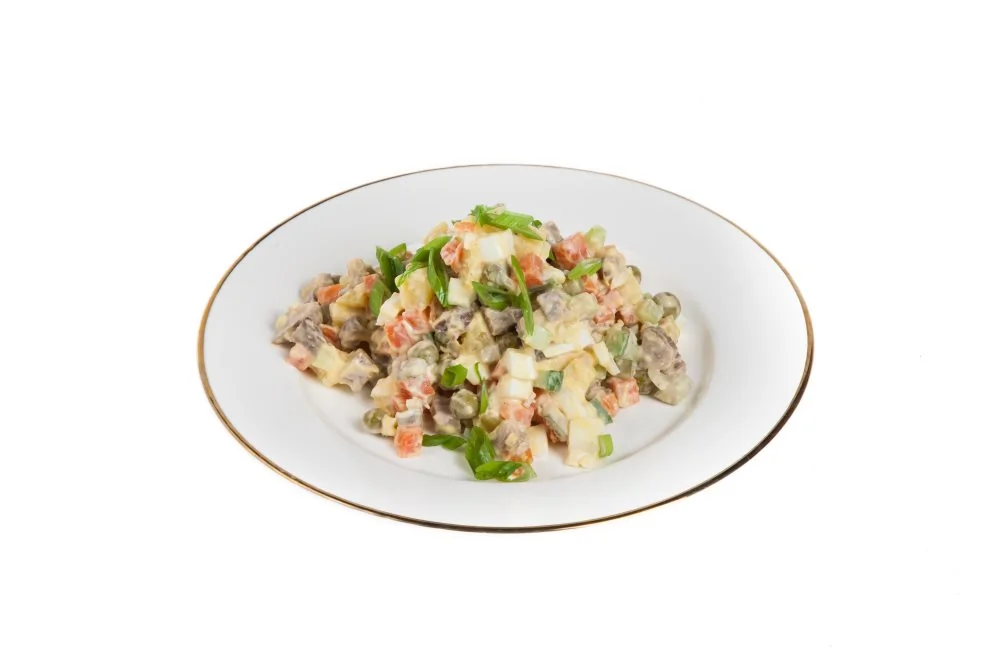 Говядина Картофель Морковь Лук репчатый Соленые огурцы Огурцы Зеленый горошек Зеленый лук Майонез Соль Перец черный молотый Яйцо куриное Пошаговые рецепты Салаты Русская кухня Оливье