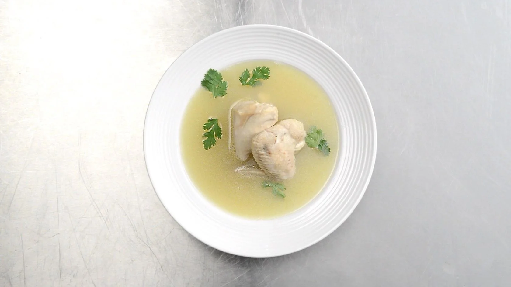 ШАГ 3 Солим, кидаем в кастрюлю перевязанный ниткой пучок кинзы с кореньями и варим на медленном огне, периодически снимая пену. Тушеная курица и лук придают супу особенный вкус — он сильно отличается от простого куриного бульона.
