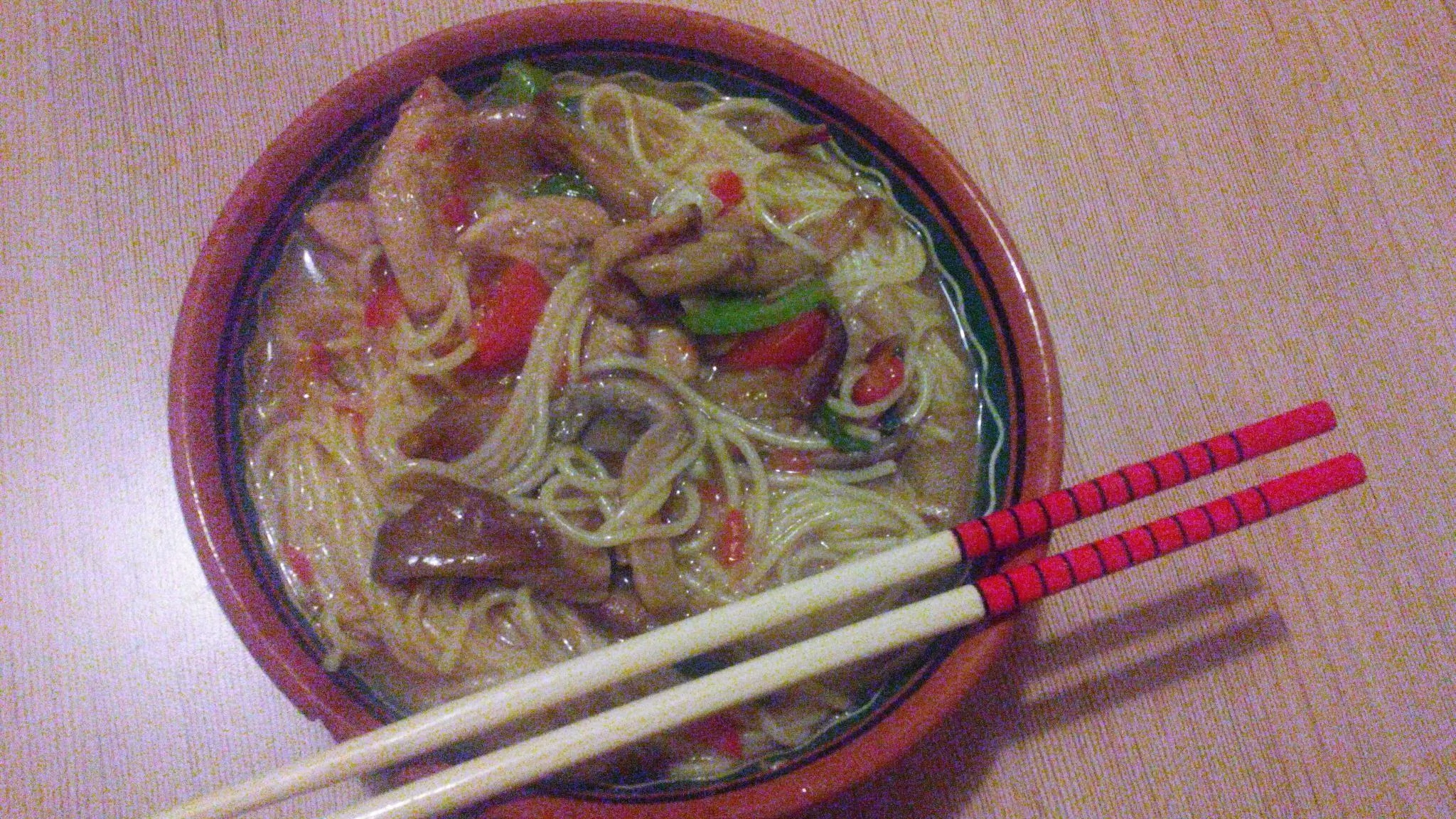 ШАГ 1 Разогреть сковородку вок и раскалить в ней растительное масло. На раскаленном масле обжарить нарезанный тонкой соломкой имбирь, нарезанную тонкими ломтиками курицу, нарезанные тонкими ломтиками грибы вешенки и мелко нарубленный чеснок. Итогом трудов должно стать такое состояние куриного мяса и грибов, при котором их уже можно было бы есть без дальнейших приключений. Грибы должны успеть пустить сок. Сок же должен успеть испариться под действием высоких температур, а вешенки обязаны приобрести приятную коричневую корочку и заполонить всю кухню настырным ароматом свежеподжаренных грибов.