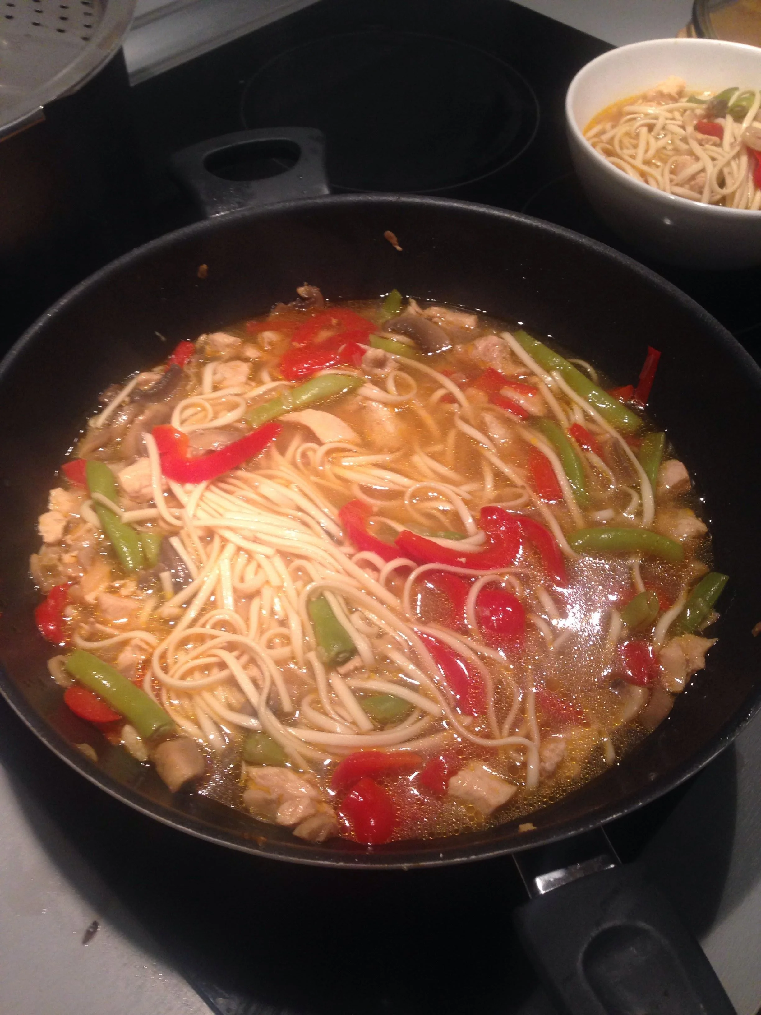 ШАГ 2 В этот момент надо добавить в сковородку соевый соус, звездочки бадьяна, мелко нарезанный сладкий перец и нарезанный тонкими кольцами перец чили, перемешать, потушить минуту и залить куриным бульоном. Варить суп пять минут.