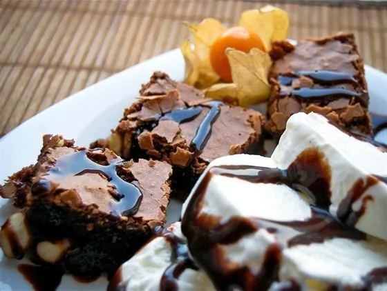 ШАГ 8 Подавать брауни можно просто так, а можно посыпать сверху сахарной пудрой или разложить квадратики по тарелкам и украсить каждую порцию шариком ванильного мороженого.