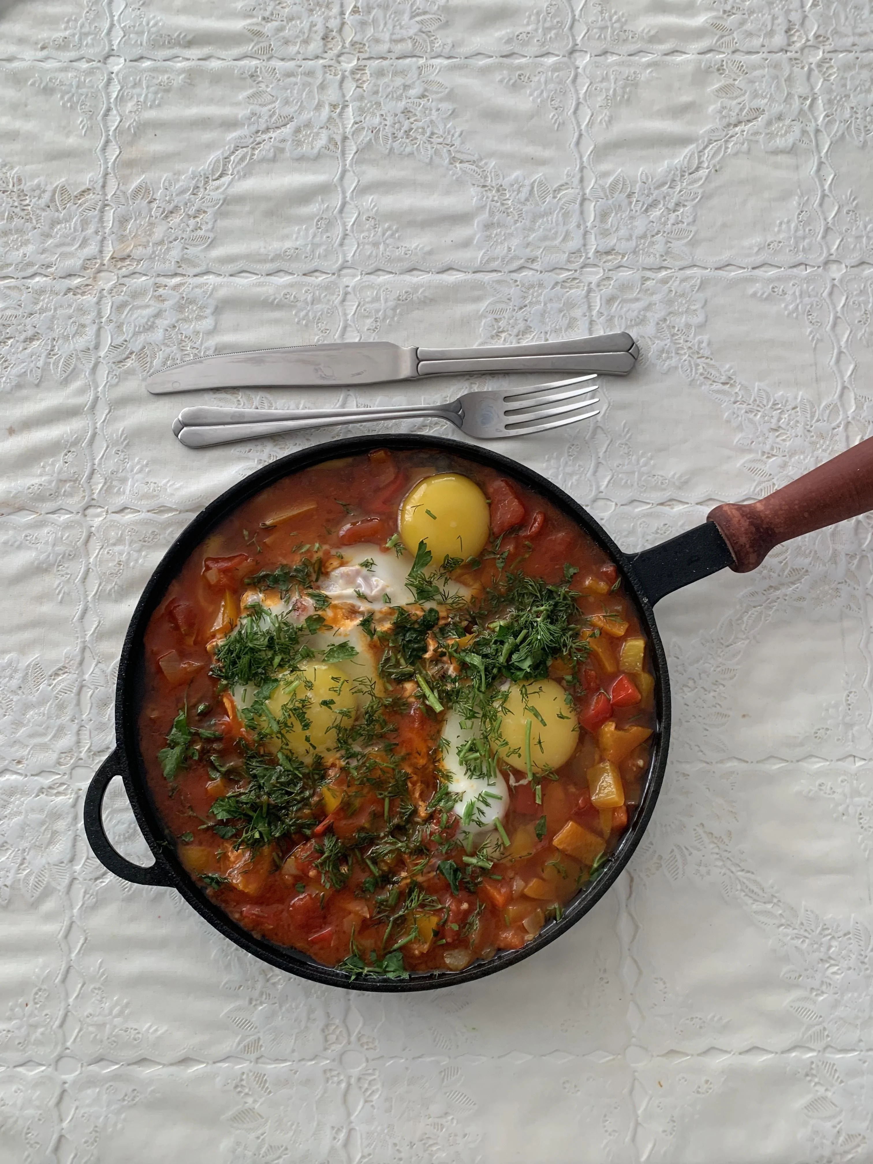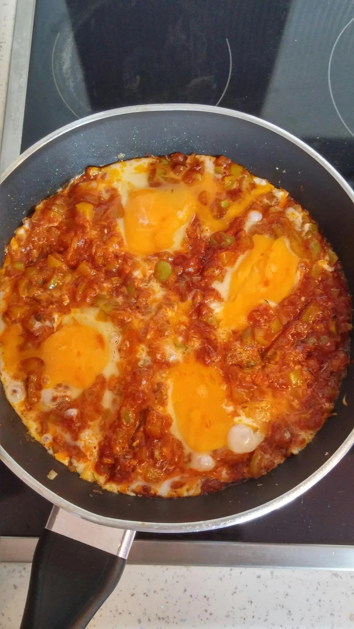 ШАГ 6 Сделать в овощах ложкой 2 небольшие выемки и выбить туда яйца. Белок аккуратно вмешать в смесь. Яйца посолить и поперчить. Держать смесь на среднем огне до момента, пока не схватится белок.