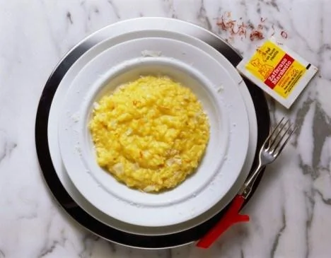 ШАГ 2 Добавить овощной бульон, шафран и тушить около 20 минут, понемногу добавляя бульон. Перемешать с сыром и сливочным маслом.