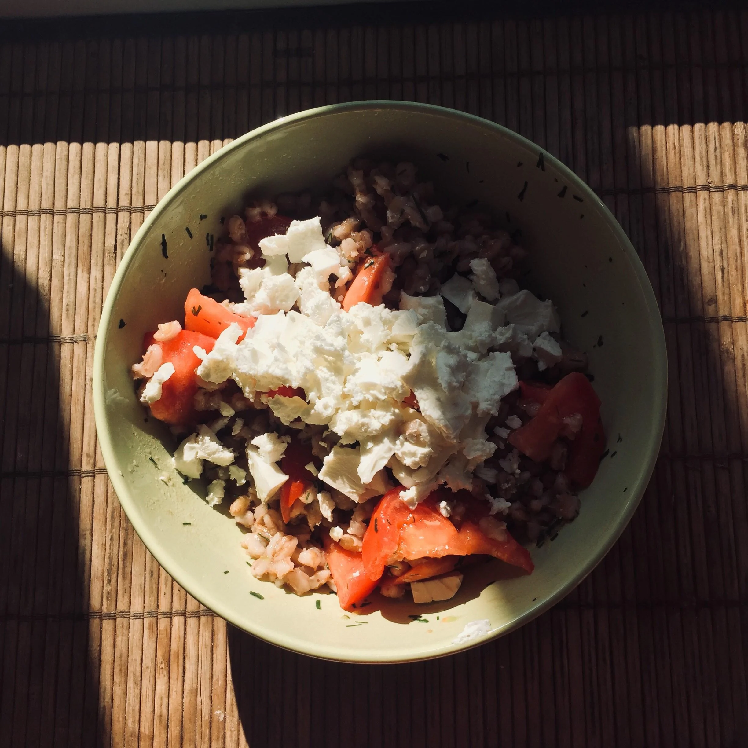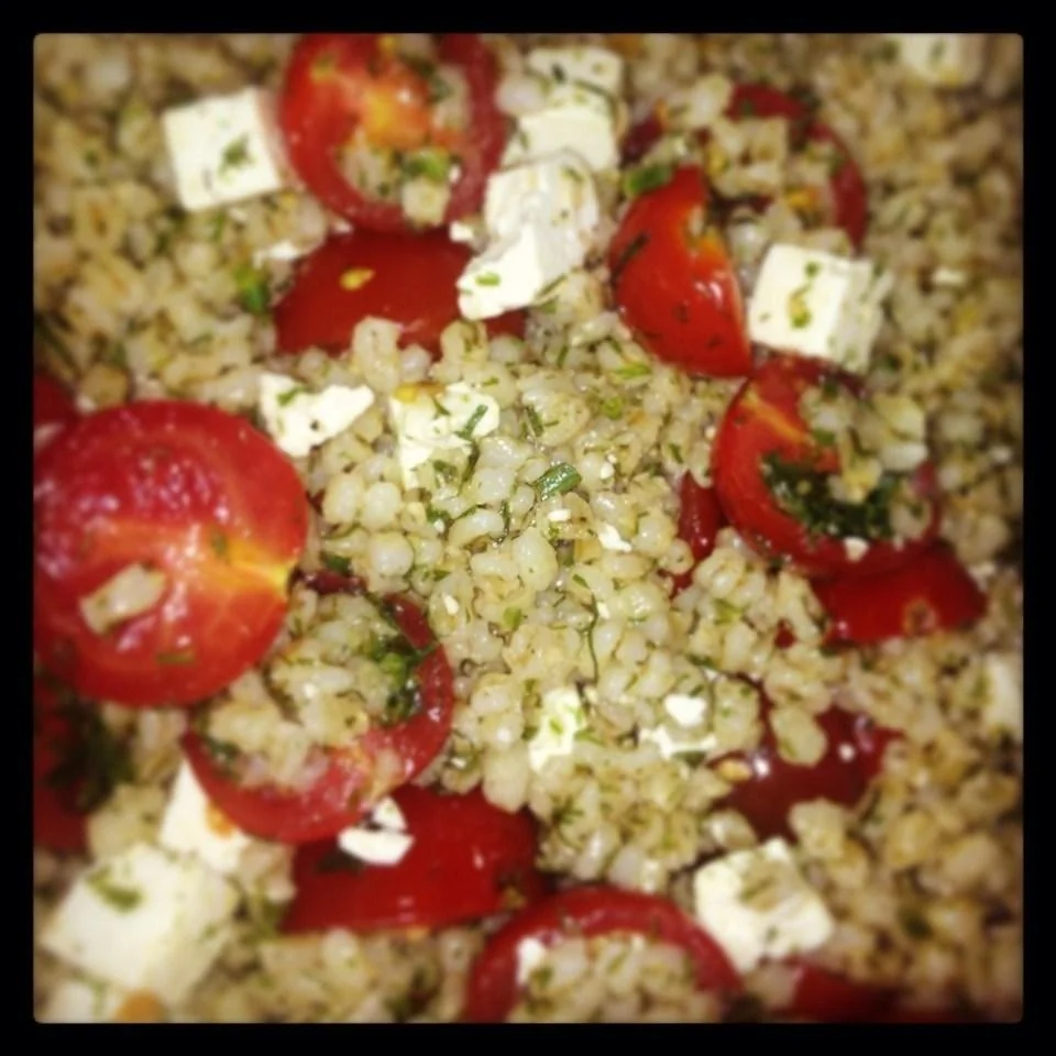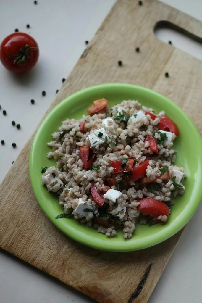 Перловка с фетой, томатами и укропом