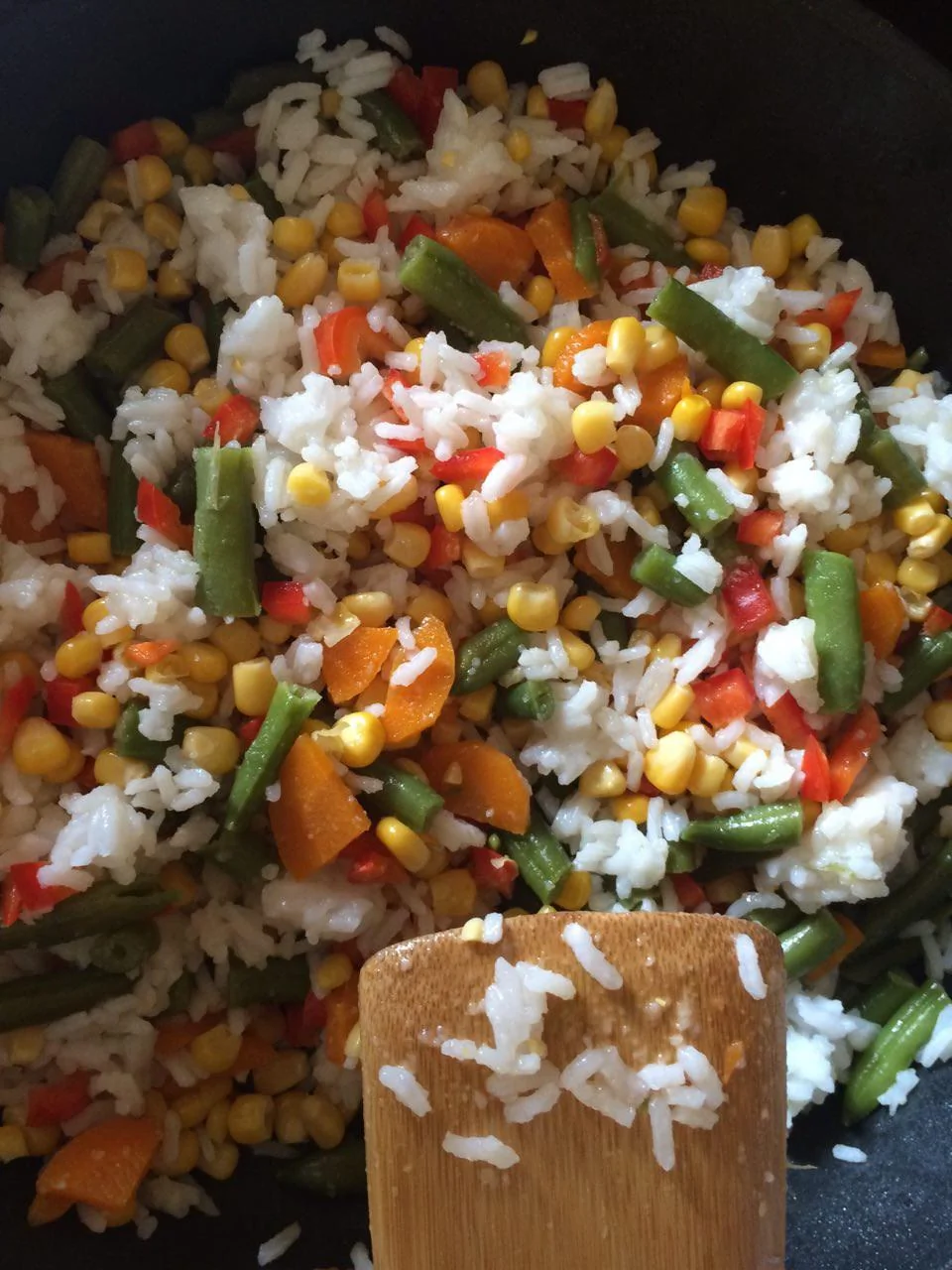ШАГ 4 Выкладываем рис, консервированную кукурузу, перец в сковородку с луком и морковью, все тщательно перемешиваем.