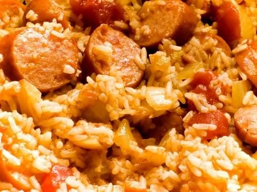 ШАГ 3 В готовый рис добавьте сливочное масло, лук и сыр, перемешайте и подавайте на тарелках, выложив сверху сосиски.