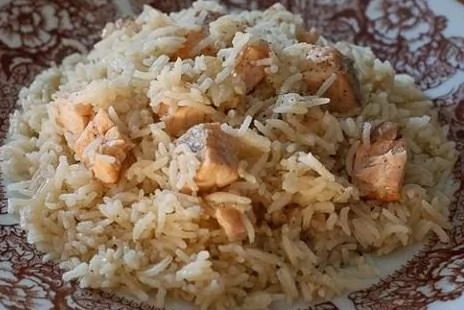 ШАГ 5 Когда рис будет почти готов, добавить нарезанную небольшими кусочками рыбу, посолить и поперчить по вкусу, аккуратно перемешать и оставить на несколько минут на медленном огне до готовности.