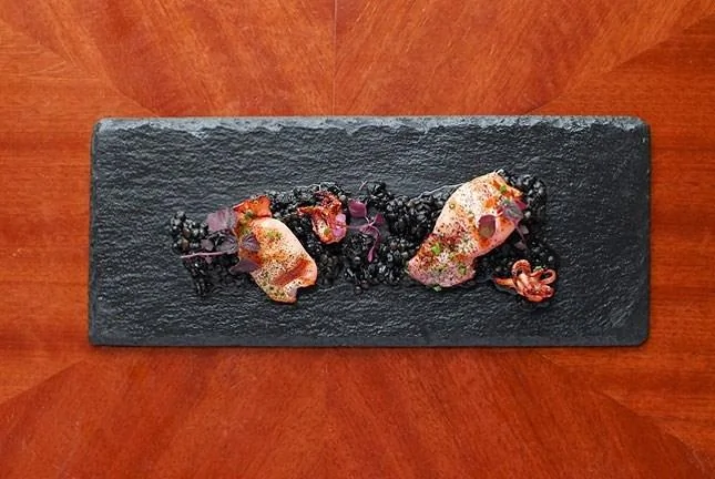 Кальмары с чечевичным ризотто и пудрой из лука-порея