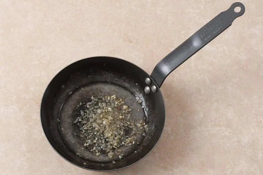 ШАГ 1 Нарежьте лук-шалот и чеснок мелким кубиком и обжарьте на оливковом масле 2–3 минуты до прозрачного состояния лука.