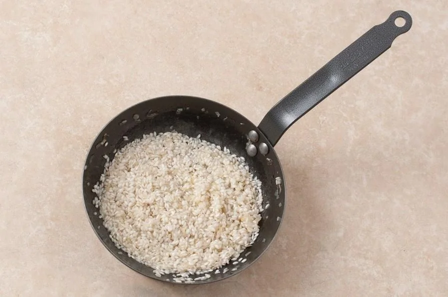 ШАГ 2 Добавьте рис и жарьте еще 1 минуту, залейте белое сухое вино и выпаривайте до исчезновения запаха алкоголя.