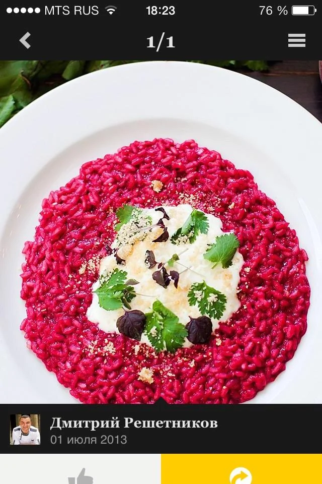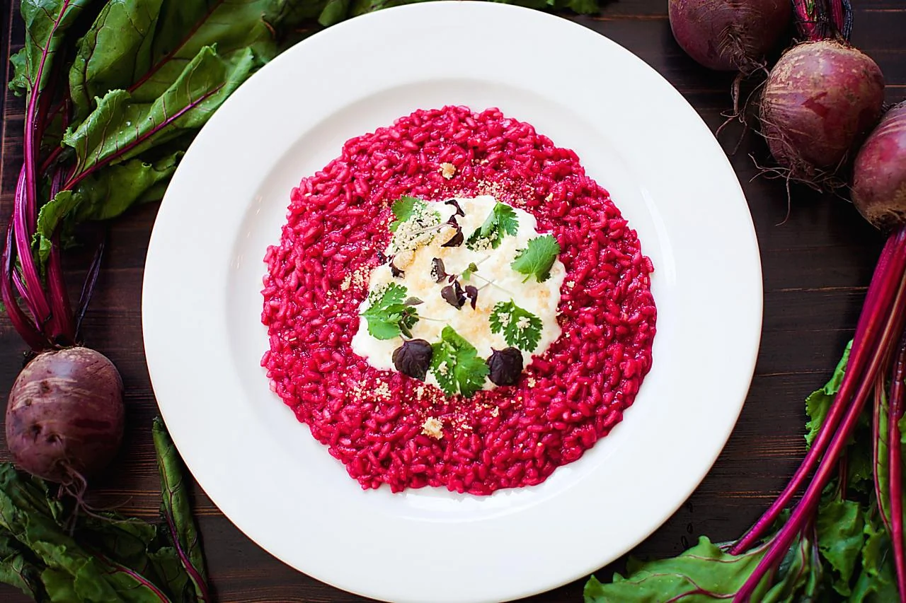 ШАГ 4 Ризотто со свекольным пюре, ароматном имбиря и лемонграсса, подается с кремом из сыра фета. Для этого необходимо взбить сливки с сыром фета в пропорциях 50 на 50. Также следует добавить рубленные грецкие орехи и листики трав.