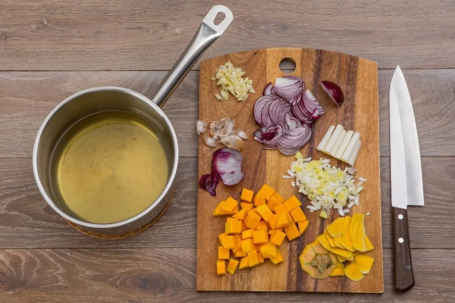 ШАГ 1 Тыкву очистите от кожуры и семян и нарежьте кусочком 1х1 см, красный лук почистите и тонко нарежьте, лук-порей мелко нарежьте, зубчики чеснока раздавите, почистите и крупно нарубите; доведите бульон до кипения.