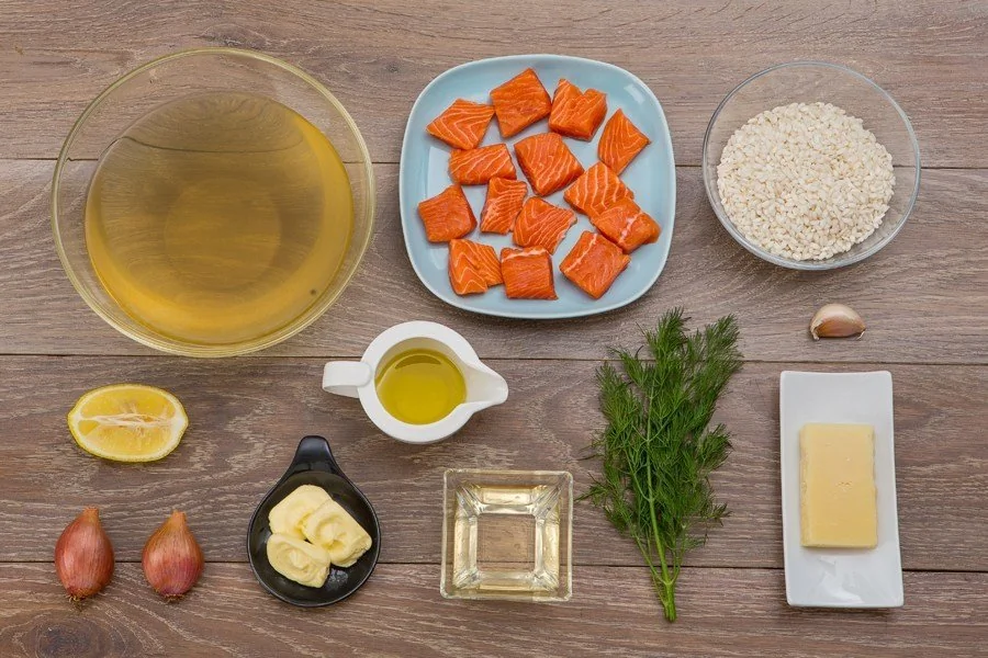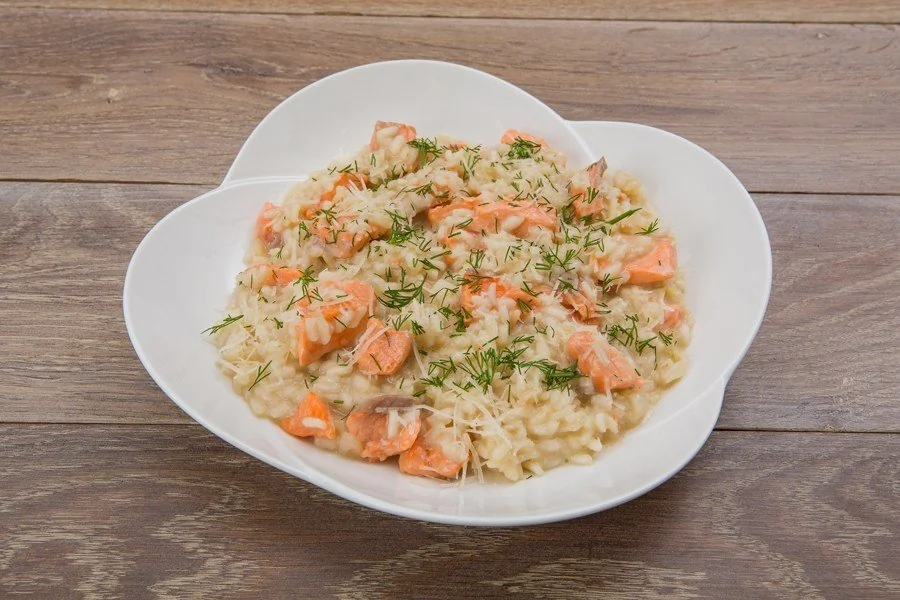 ШАГ 6 Добавьте рыбу в ризотто, перемешать и тушить 30 секунд.