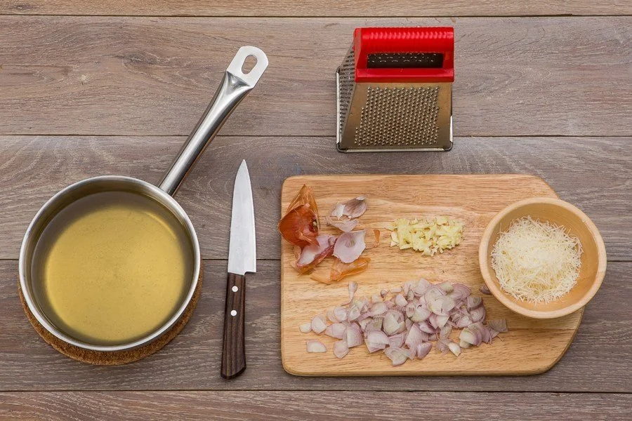ШАГ 1 Очистите и мелко нарубите лук и чеснок, пармезан натрите на мелкой терке; доведите до кипения овощной бульон.