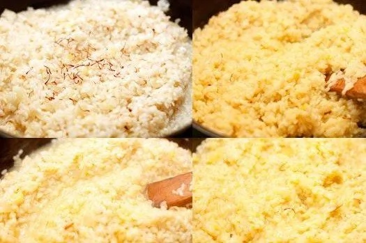 ШАГ 3 Когда вино выпарится, добавляем шафран, перемешиваем. Теперь по одному половнику (около 200 мл) добавляем в рис рыбный бульон. Когда первый половник бульона практически полностью выпарится, добавляем второй, за вторым — третий и т.д., пока не кончится бульон.