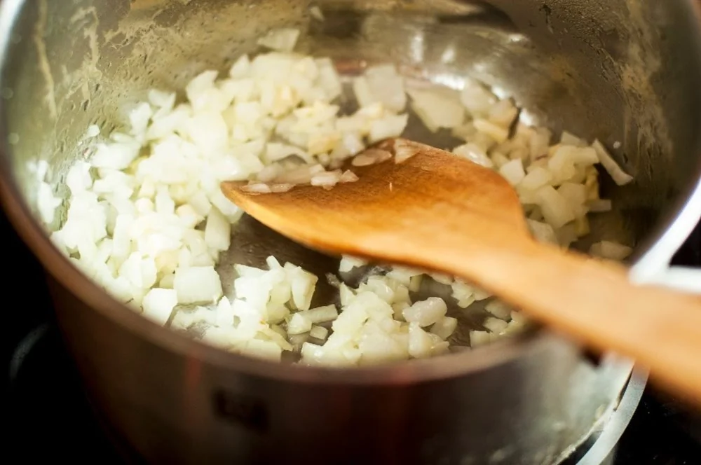 ШАГ 1 Нарежьте лук и чеснок мелким кубиком, обжарьте в горячей сковороде или кастрюле (кому как удобно) на оливковом масле в течение 2–3 минут.
