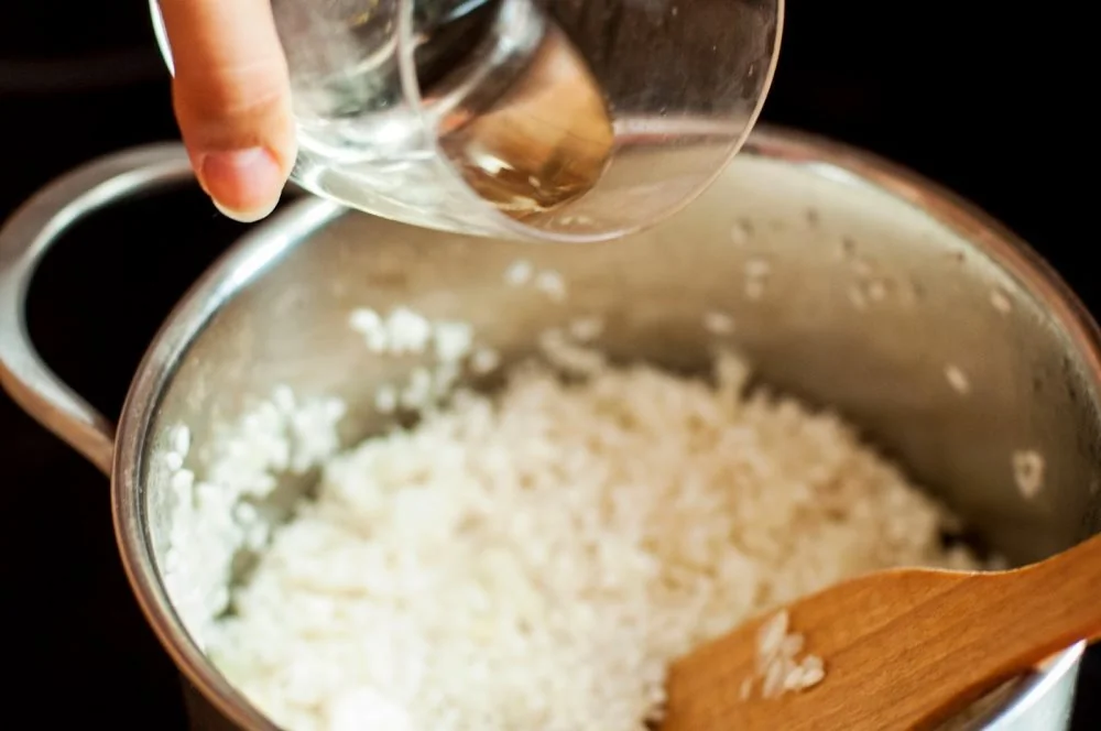 ШАГ 3 Залейте в рис белое вино и выпаривайте его до тех пор, пока не исчезнет запах алкоголя. Далее вам понадобится бульон. Влевайте его в рис постепенно: сначала на 3/4, потом добавляйте небольшими порциями по мере необходимости в течение 15-ти минут.