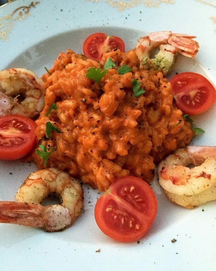 ШАГ 8 Готовое ризотто выложить в центр тарелки, по краям положит креветки и помидоры черри, сверху посыпать рубленой петрушкой по желанию