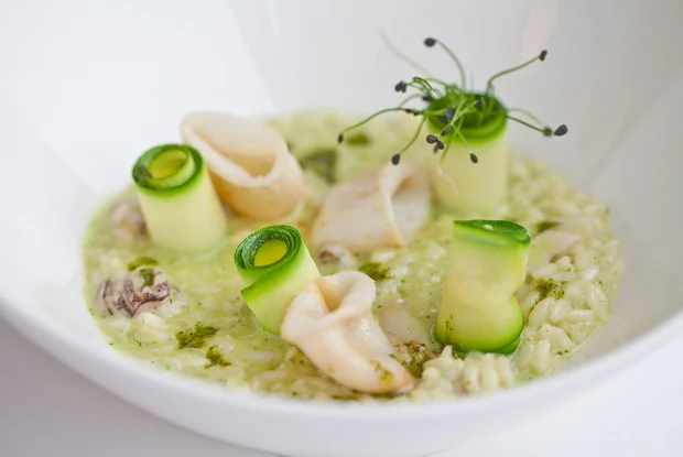 Ризотто с мини-кальмарами, цуккини и соусом песто