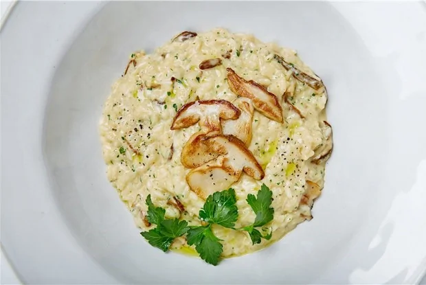 ШАГ 4 Выложить ризотто в тарелку, украсить кусочками белых грибов и петрушкой.