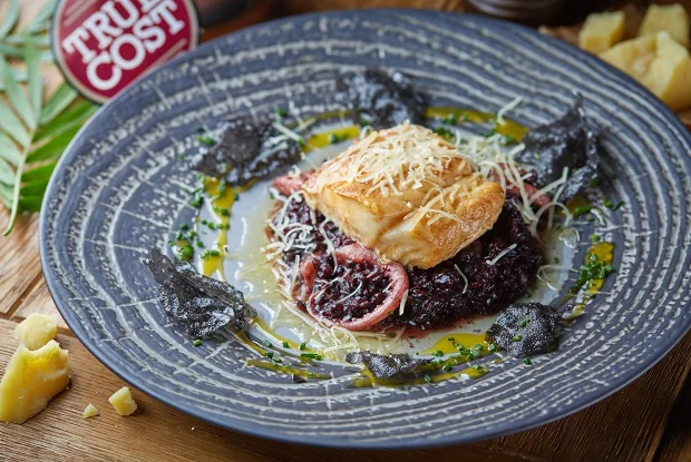 ШАГ 2 В базу риса добавить обжаренного на сливочном масле отварного осьминога, добавить соус Терияки, затянуть тертым пармезаном. Треску посолить, поперчить, смазать маслом с паприкой, запечь в духовке до готовности. На тарелку выложить ризотто из риса, сверху в центр треску, украсить тертым пармезаном.