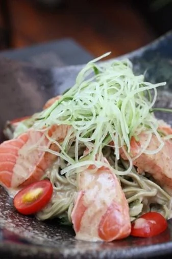 Ингредиенты для приготовления Теплый салат из гречневой лапши с помидорами и лососем: