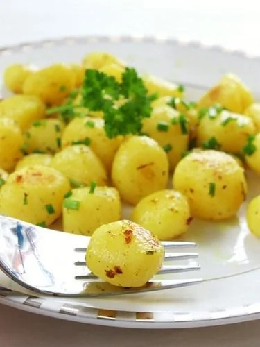 ШАГ 3 Картофель нарежьте половинками и смешайте с заправкой.