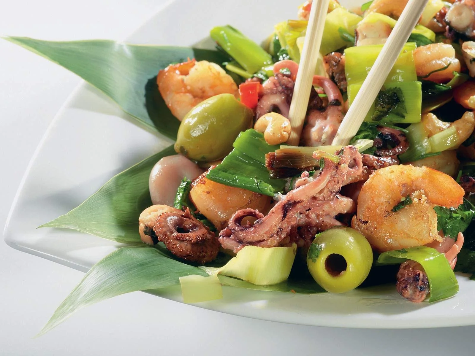Ингредиенты для приготовления Теплый салат с пореем и морепродуктами: