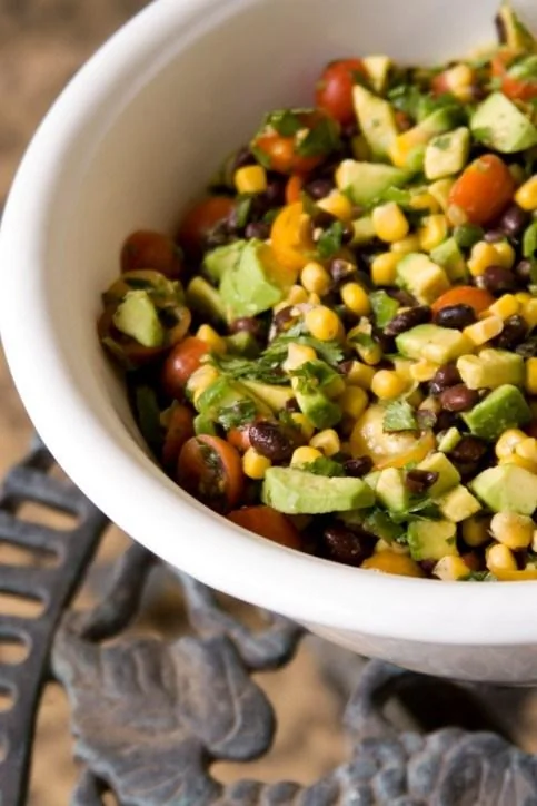 ШАГ 2 В миску с заправкой добавьте зерна кукурузы, мелко нарезанное авокадо, разрезанные на 4 части черри и мелко нарезанный красный лук. Хорошо перемешайте и подавайте комнатной температуры.