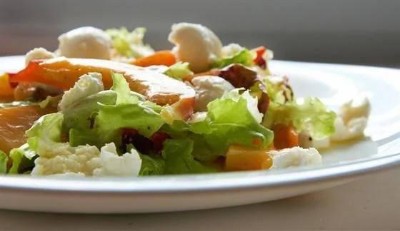 Салат с прошутто, персиками, рикоттой и латуком