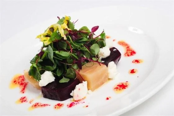 Салат из печеной свеклы с рукколой, мангольдом и козьим сыром