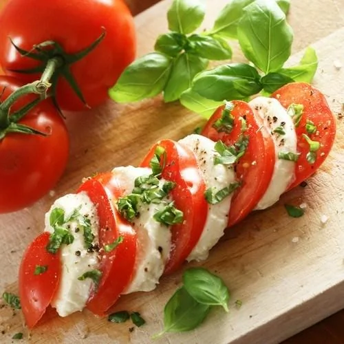 Ингредиенты для приготовления Капрезе с моцареллой буффало и зеленым базиликом: