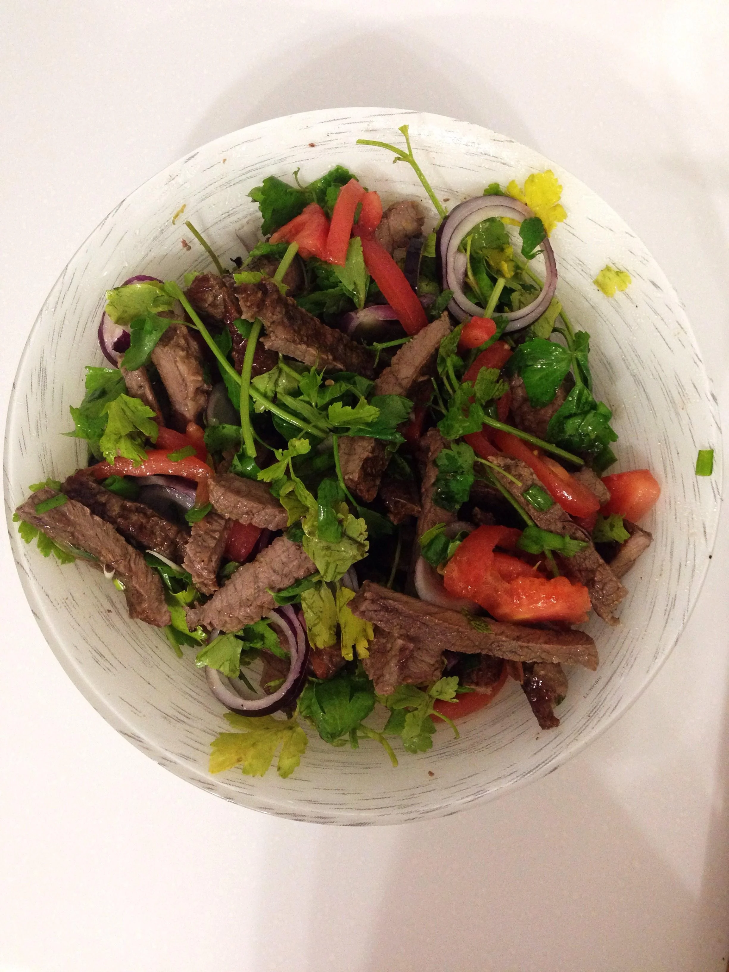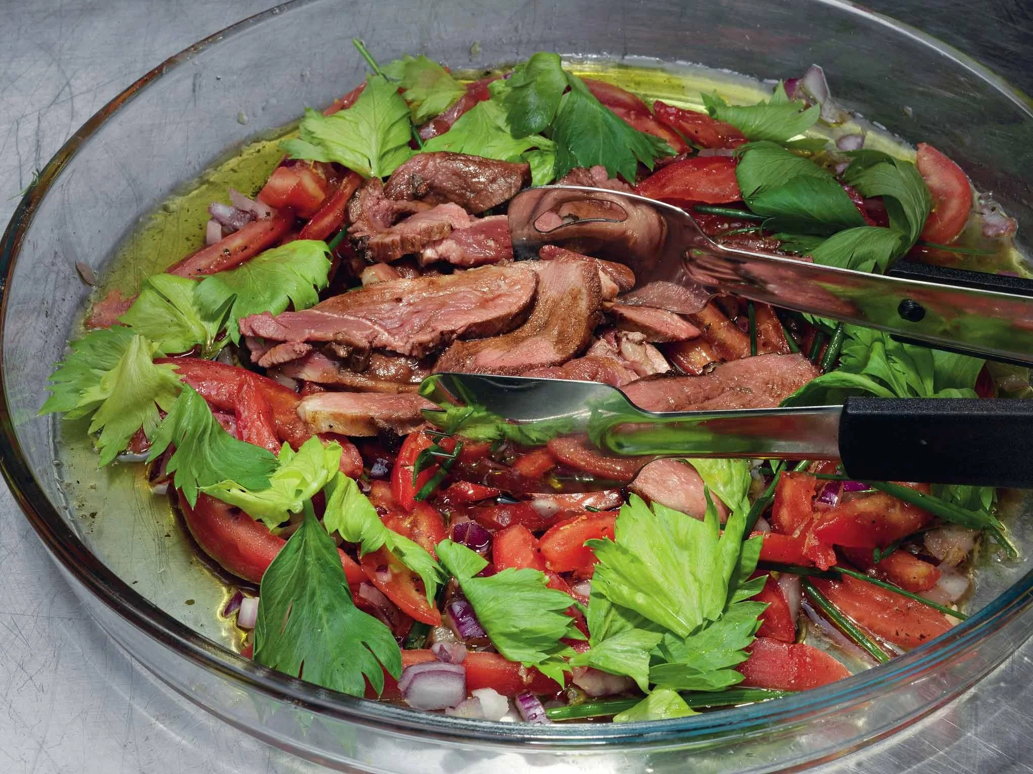 Говядина с томатами, базиликовым маслом и листьями сельдерея