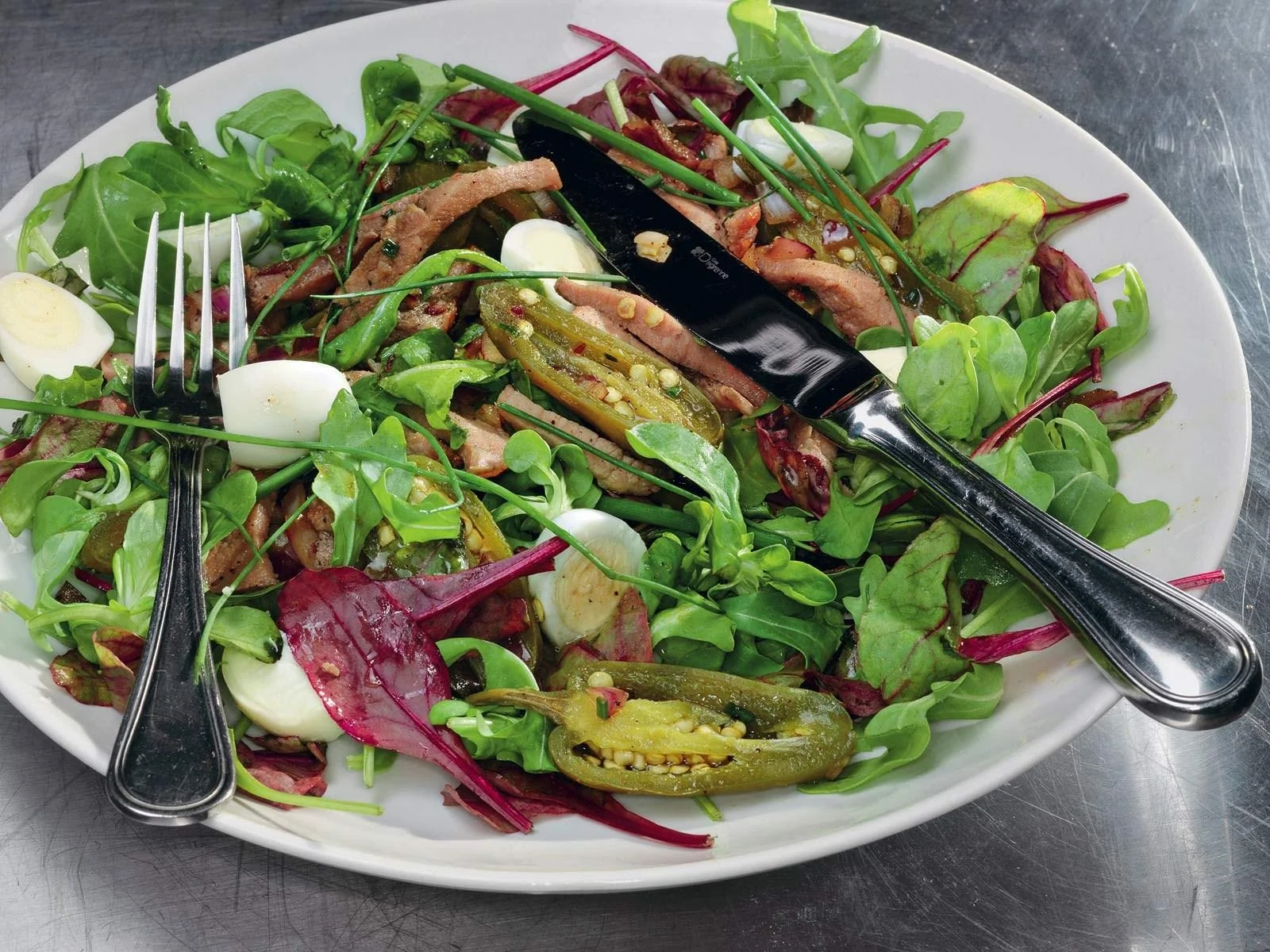 ШАГ 4 Свинину нарезать тонкими ломтиками, перцы разрезать на половинки. Смешать салатные листья с соусом, сверху выложить яйца, свинину, перцы и посыпать крупно нарезанным зеленым луком.