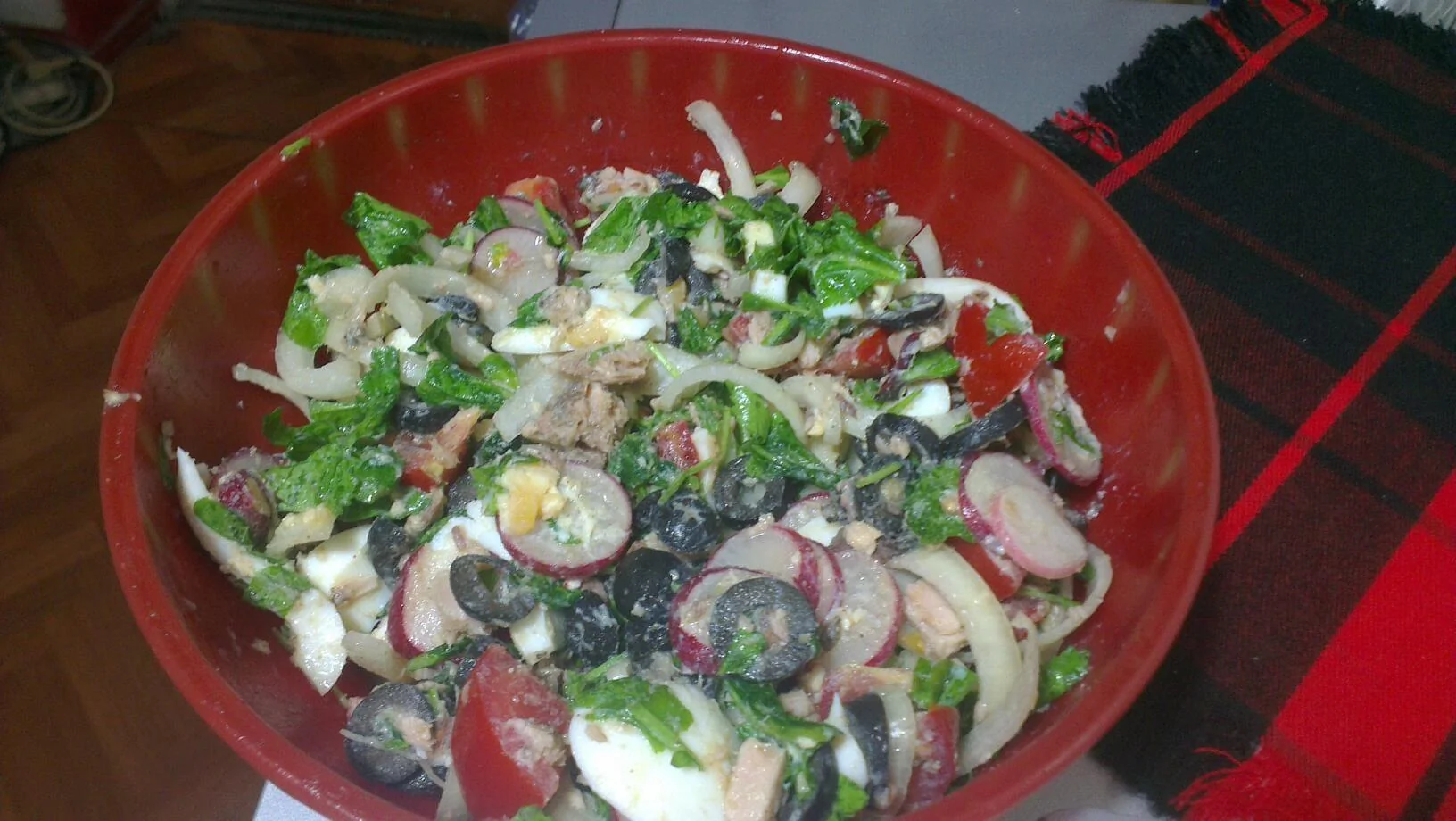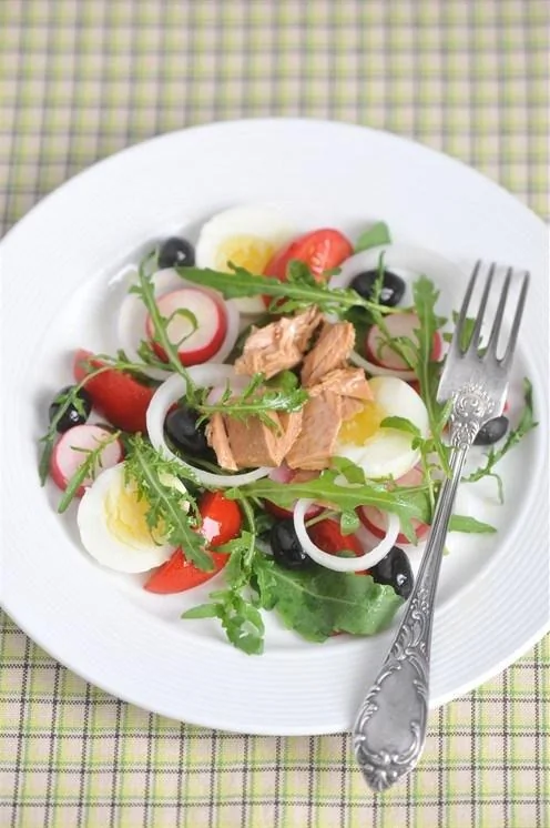 Маслины Рукола Яйцо куриное Консервированный тунец в масле Белый лук Редис Оливковое масло Винный уксус Помидоры Соль Перец черный молотый Салаты Французская кухня