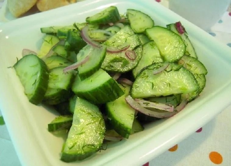 Огуречный салат с красным луком, укропом и сметаной по гречески