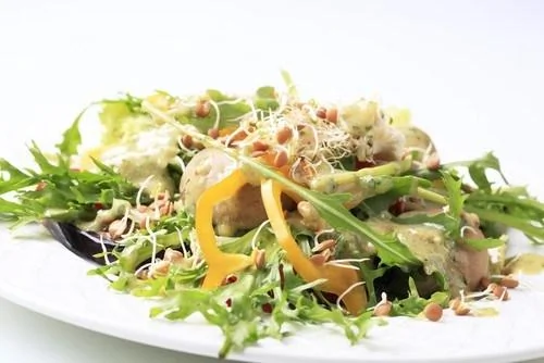 Теплый грибной салат в соусе из маскарпоне с рукколой