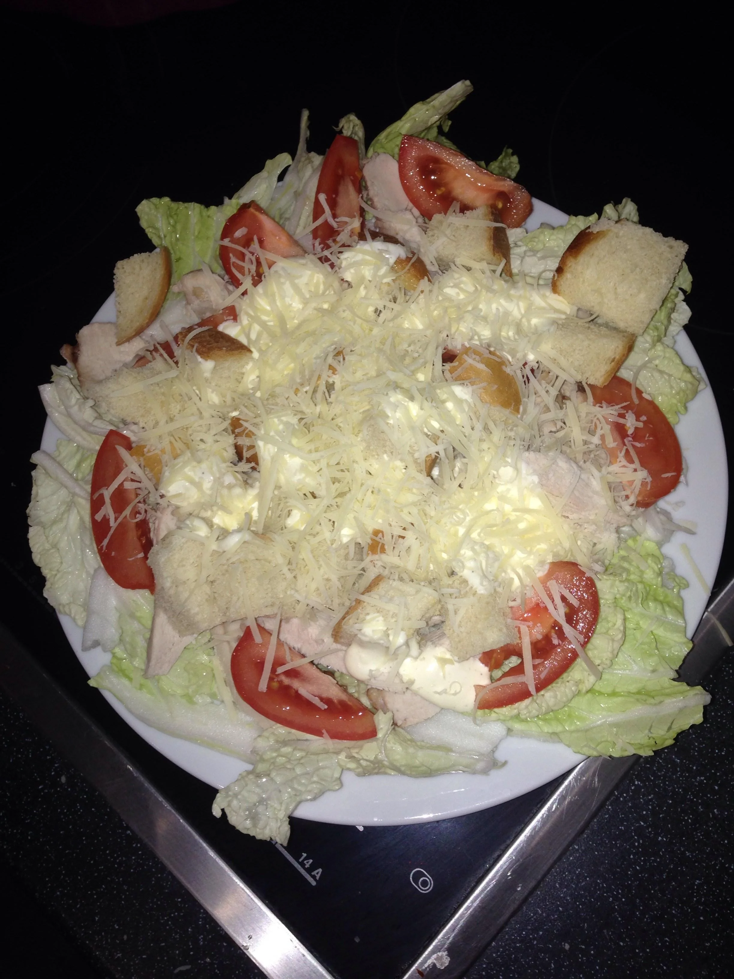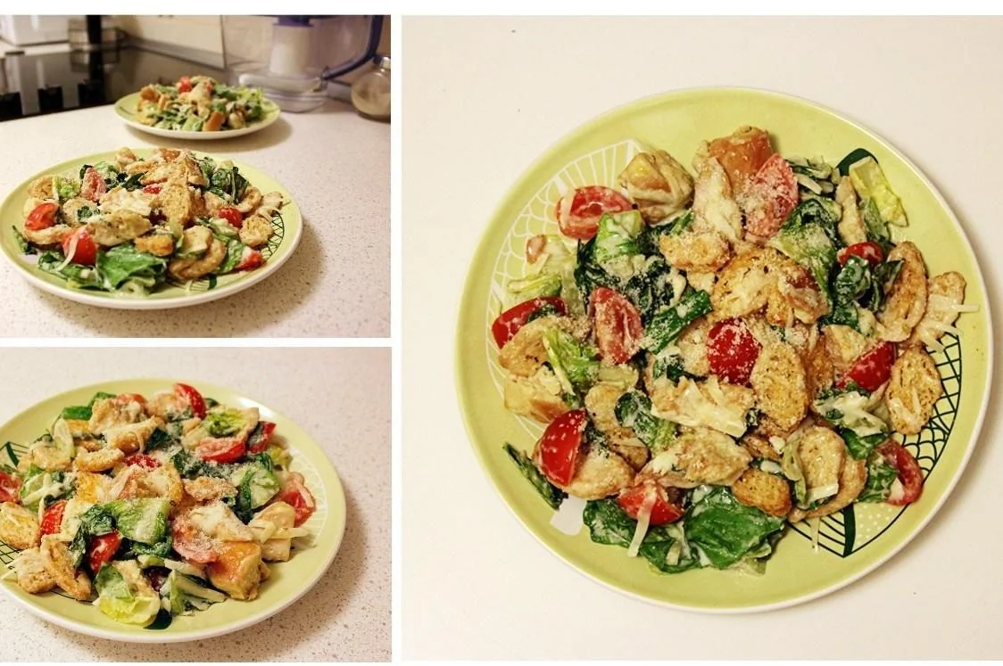 ШАГ 4 Выкладываем на тарелку листья салата, куриные грудки, добавляем сухарики, заправляем соусом «Сырный цезарь», посыпаем тертым пармезаном и украшаем дольками помидора.