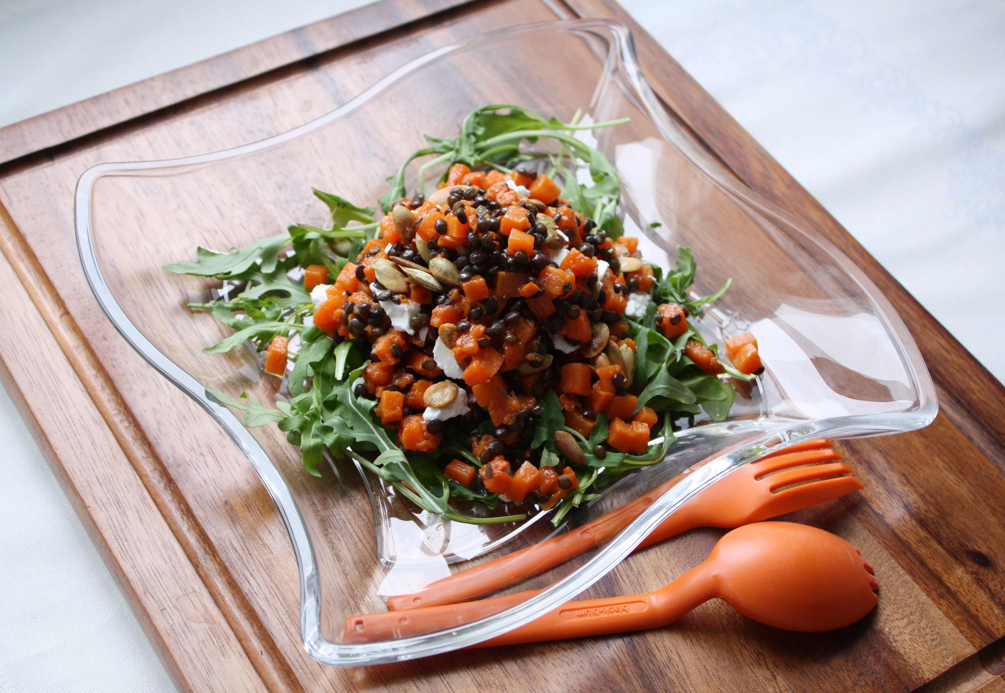 Теплый пряный салат с козьим сыром, тыквой и черной чечевицей