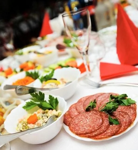 ШАГ 3 Сервелат нарезать очень мелкими кубиками. Соединить овощи, яйца, сервелат и зеленый горошек в глубокой миске, поперчить, посолить, добавить майонез и хорошо перемешать. Выложить оливье в салатник и посыпать мелко нарубленной зеленью.