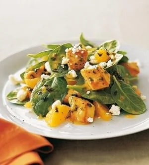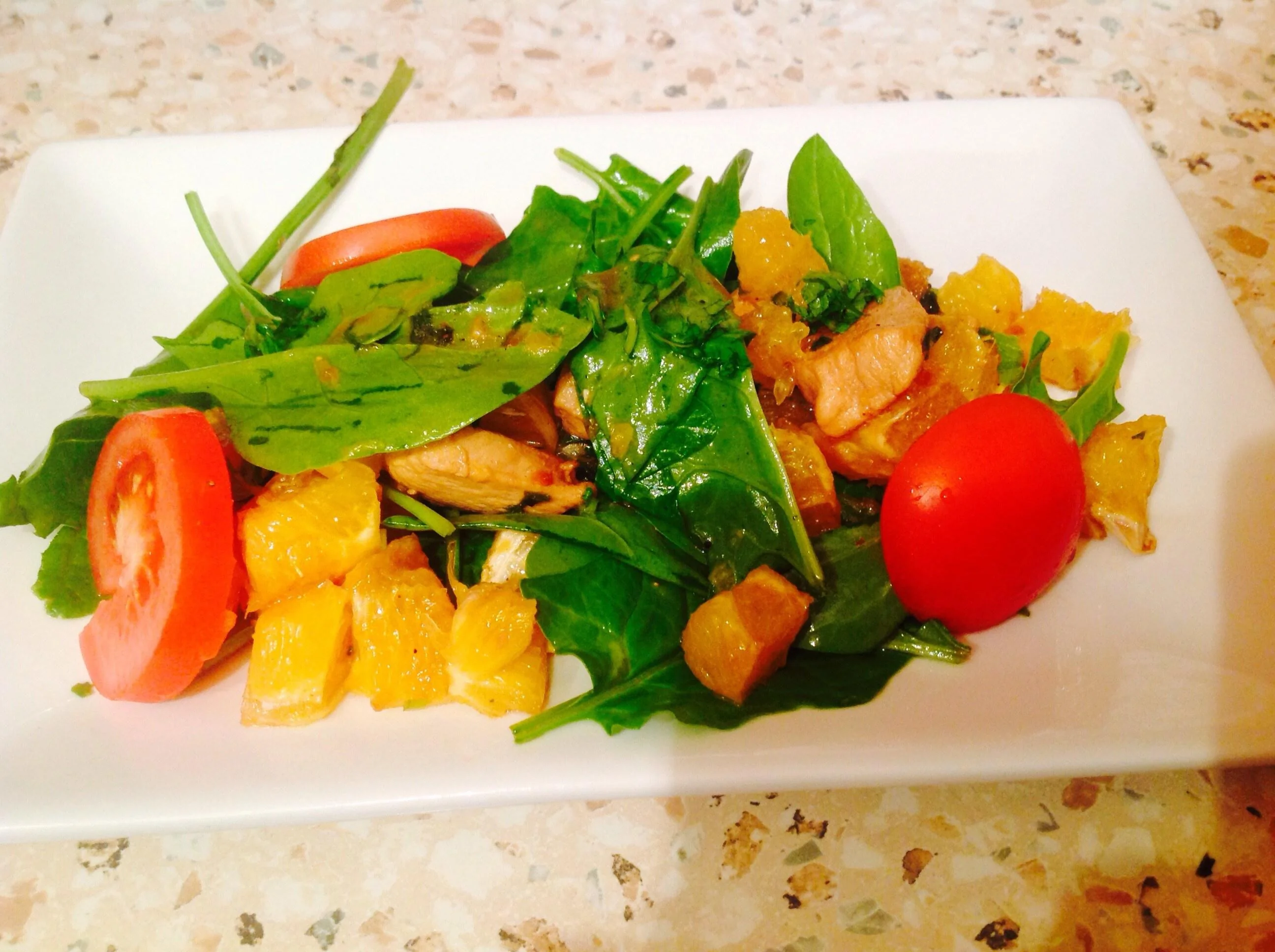 ШАГ 3 В отдельную глубокую емкость сложите шпинат, кусочки апельсина, еще теплую курицу в соусе и аккуратно перемешайте.