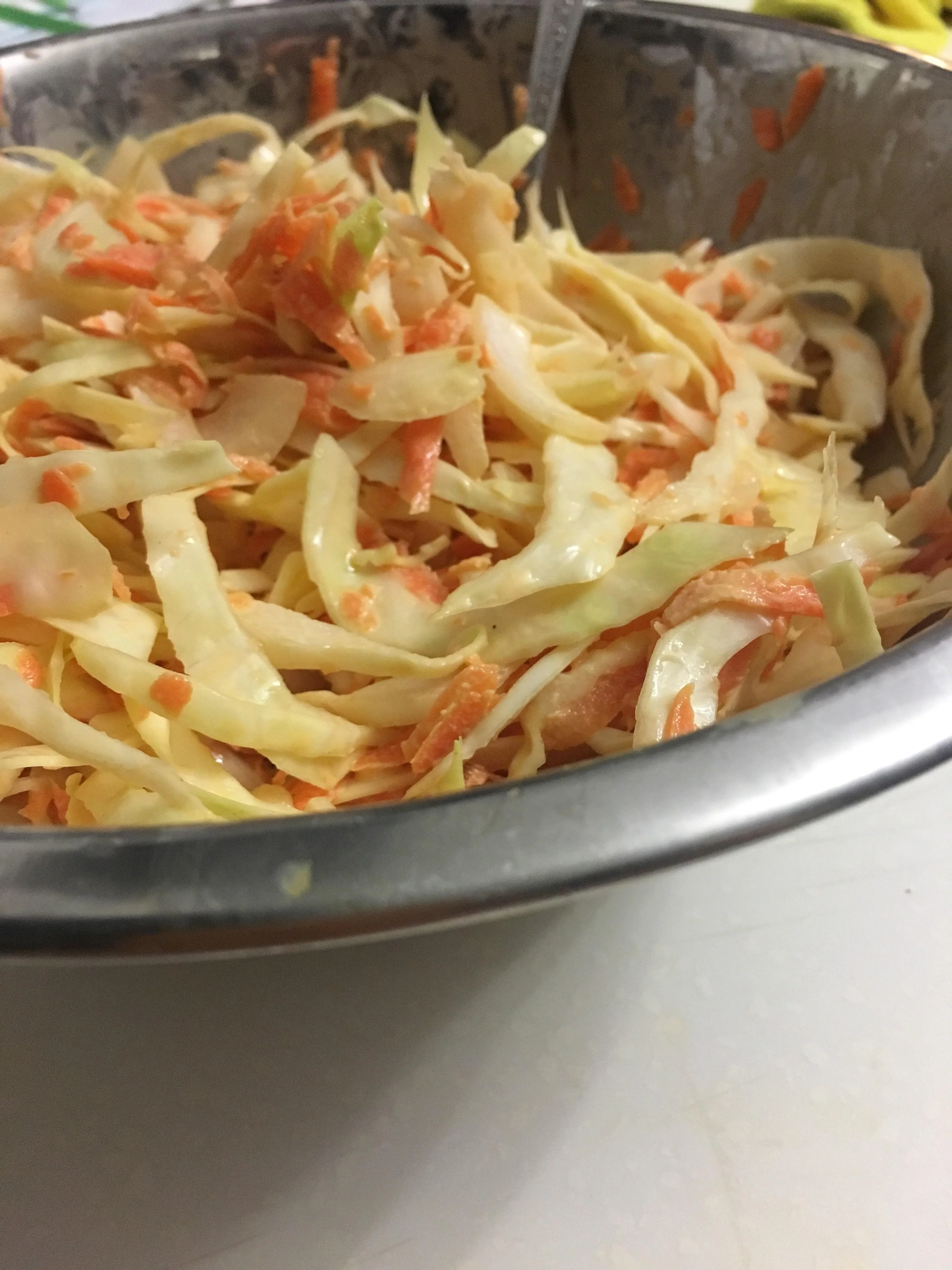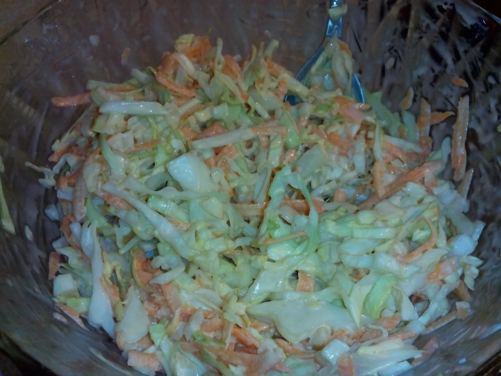 ШАГ 1 Капусту тонко нашинковать. Морковь натереть на терке, а луковицу измельчить. Все остальные ингредиенты смешать в отдельной миске и слегка взбить. Перемешать лук, морковь и капусту, выложить в салатник. Заправить соусом, добавить по вкусу соль и перец.