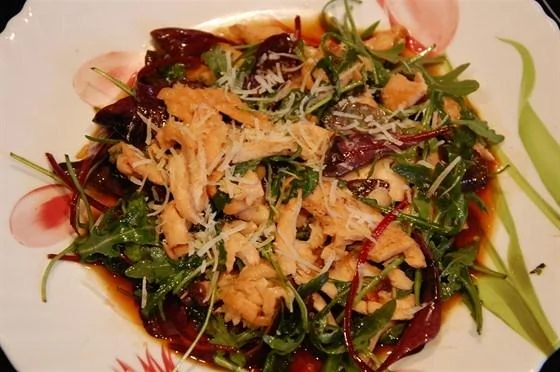 ШАГ 1 Свежий лосось обжарить на кунжутном масле на сильном огне 1–2 минуты, выложить на листья салата и полить соусом (соевый соус, мелко нарезанный имбирь, сок лимона).