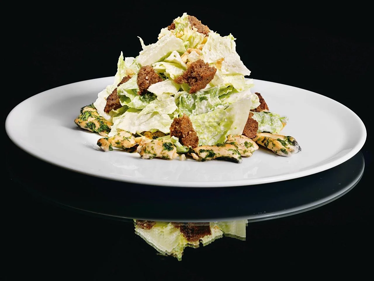 ШАГ 6 Разложить на тарелках кусочки курицы, сверху выложить листья салата.
