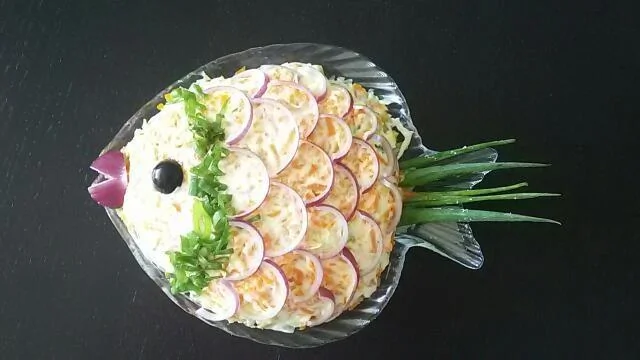 ШАГ 8 Сверху салат украсить салат по желанию (я украсила в виде рыбки) и дать настояться в холодильнике минимум 3 часа.