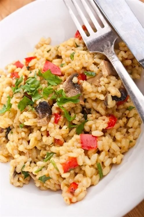 ШАГ 4 Переложить рис в большую салатную миску, добавить помидоры, грибы, перец и петрушку.
