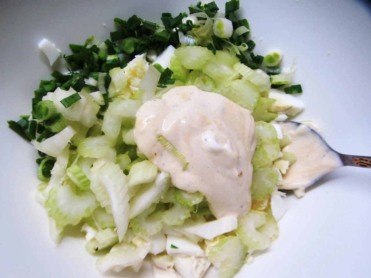 ШАГ 2 Добавьте сельдерей, майонез, горчицу и мелко нарезанный лук. Перемешайте, посолите и поперчите.